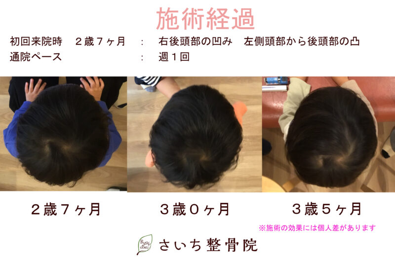 生後3ヶ月頃から右への向き癖が強く、右後頭部の凹みと左側頭部の出っ張りが見られました。